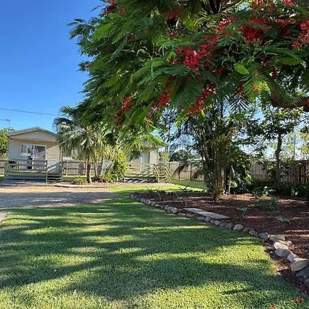 A kitchen has an electric kettle and a refrigerator. The nearest airport is Gladstone, located 60 km from this campsite.